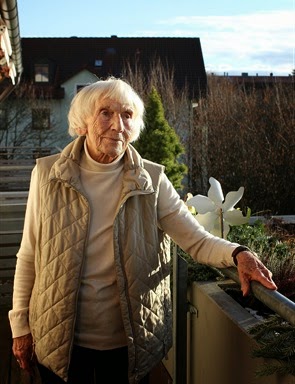 {My grandmother on her balcony looking at the Alps} {The view from my Munich hotel}